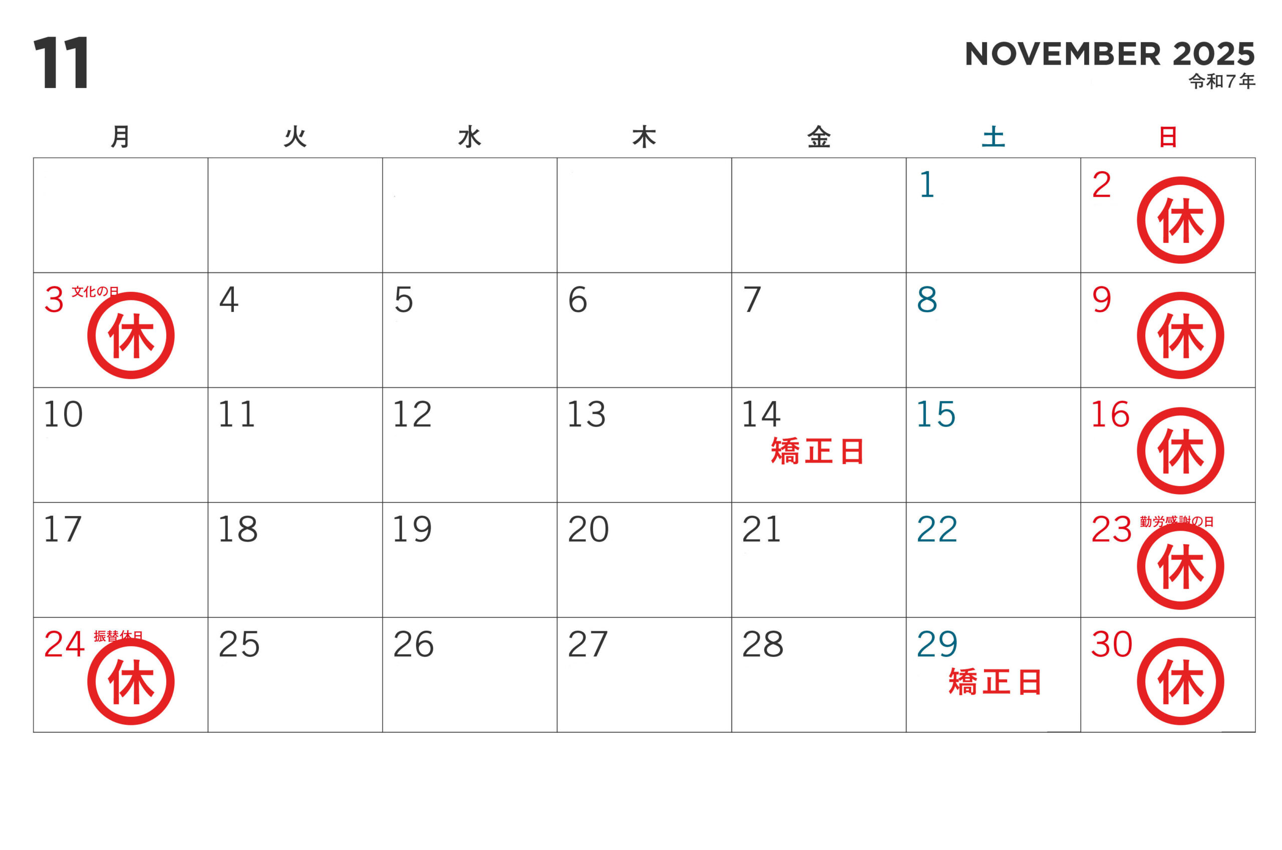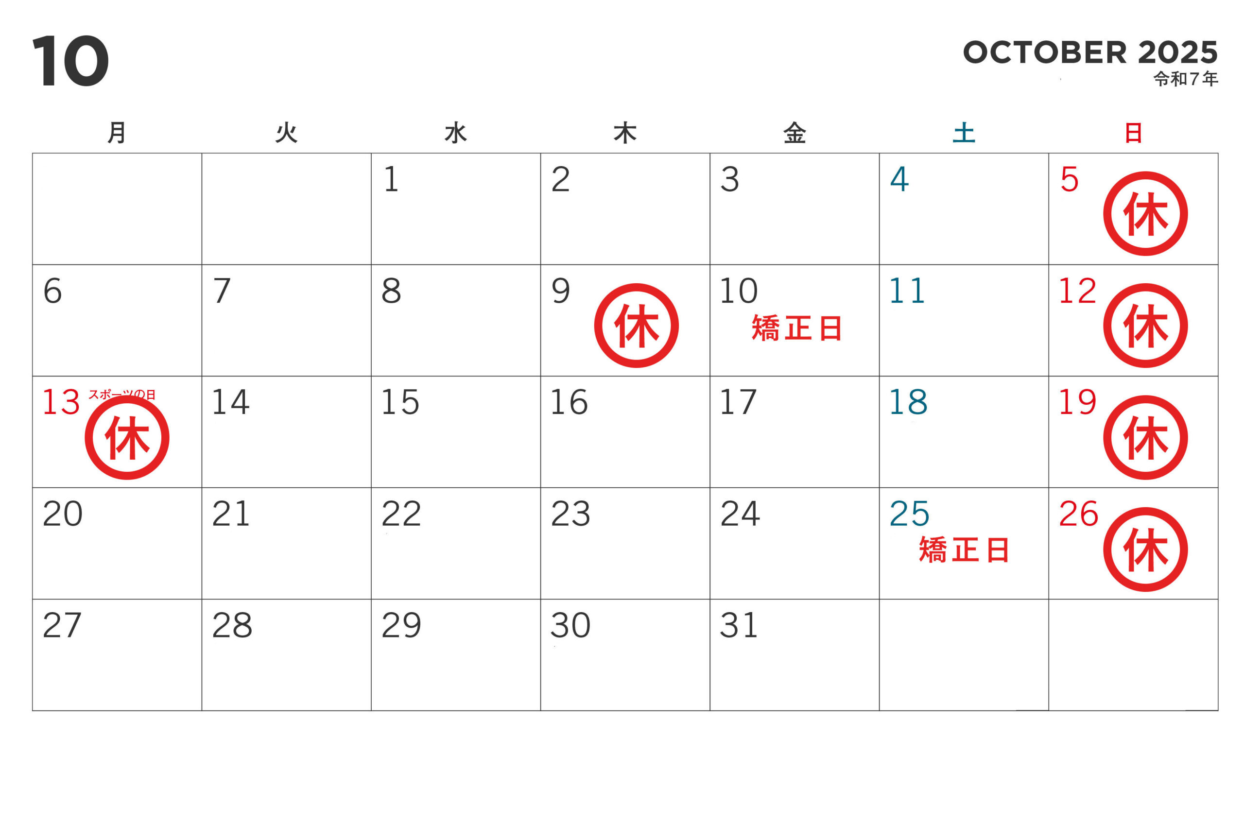 2025年09月30日 10月、11月の休診日のお知らせ 当院では下記日程を休診とさせていただきます。 あらかじめご了承頂きます様、お願いいたします。 ※10/10、10/25 矯正日 ※11/14、11/29 矯正日