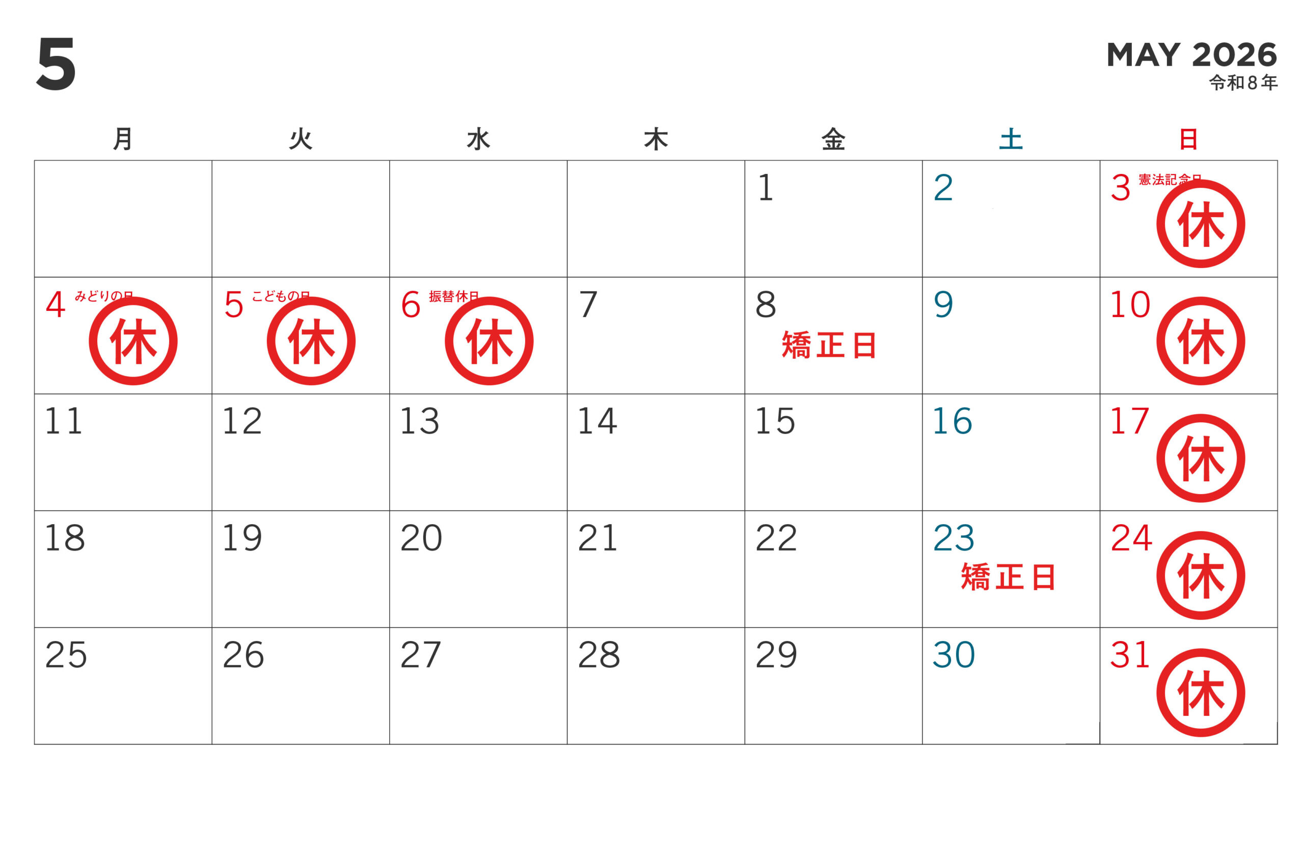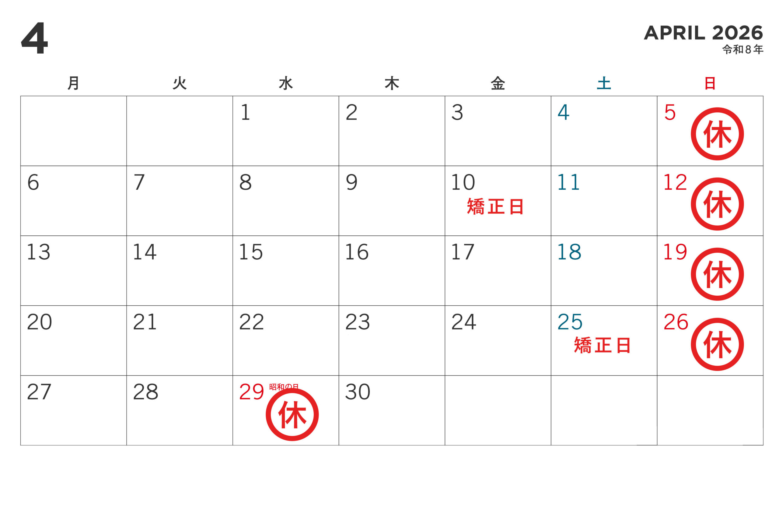 2026年04月01日 4月、5月の休診日のお知らせ 当院では下記日程を休診とさせていただきます。 あらかじめご了承頂きます様、お願いいたします。 ※4/10、4/25 矯正日 ※5/8、5/23 矯正日